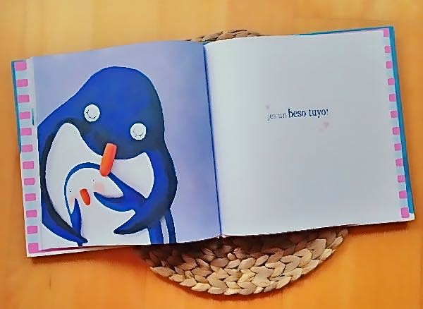 Siguiendo las indicaciones de la guía de padres, a lo largo del cuento (que como decía tiene muy poca letra), me centro en explicar los diferentes animales, los colores, como se dan el beso, en contarle cosas sobre el contexto (sobre el mar, la nieve, la hora de ir a dormir...) y por supuesto en tratar de repetir el beso él y yo, además de incitarle a dar besitos a sus amiguitos de cuento... ¡lo pasamos genial y son momentos únicos!. Álex ya tiene favorito y es el pingüino, aunque le sigue muy de cerca el elefante blue.